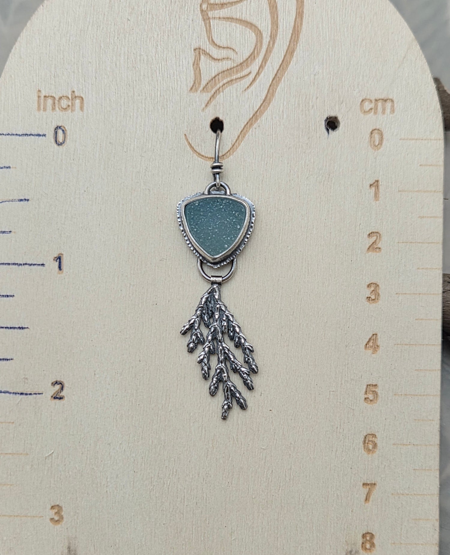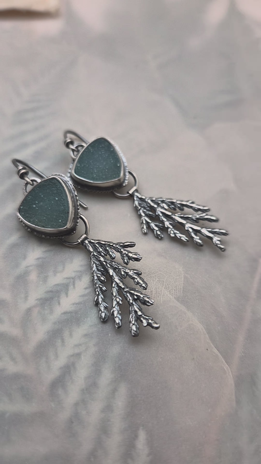 Blue druzy quartz stones, with cast sterling silver cedar fronds. All sterling silver.