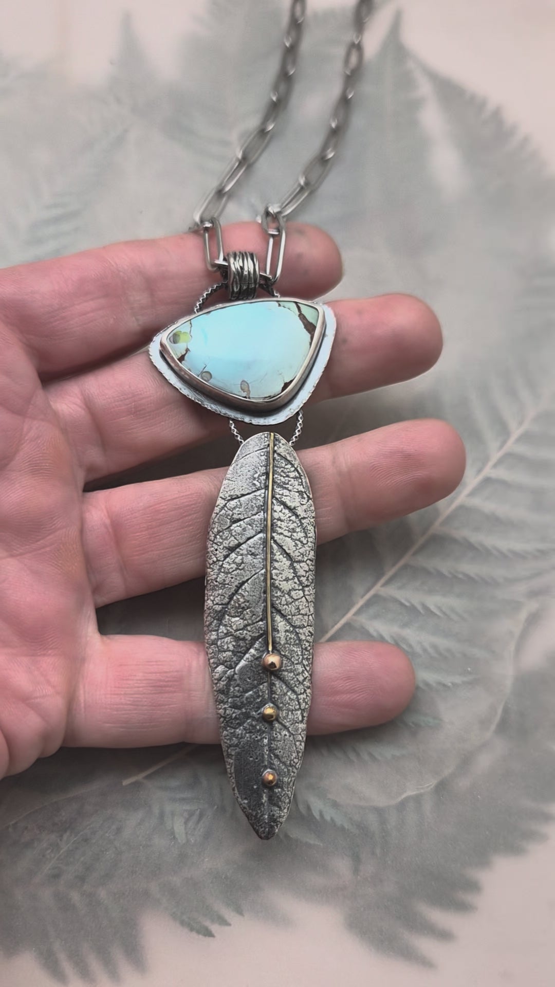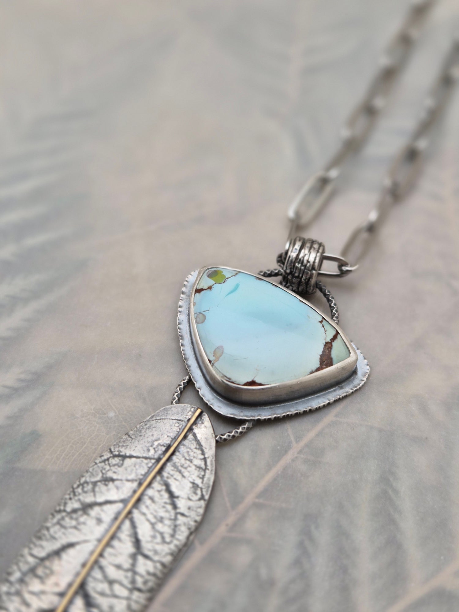 Stunning Gobi desert turquoise that I have paired with a long silver leaf made with a Live Oak tree leaf that I collected from South Carolina many years ago. The warm metal detail is a mixture of brass and copper. Comes on a long sterling silver chain, 27" in length, that is adjustable. The focal piece is 3.75" long.