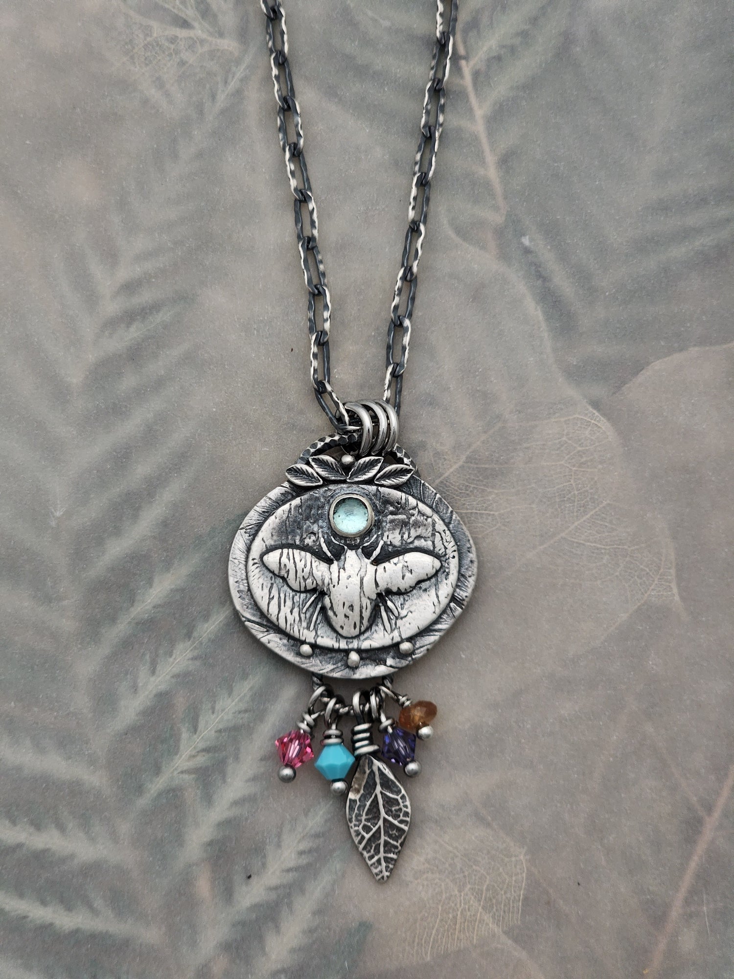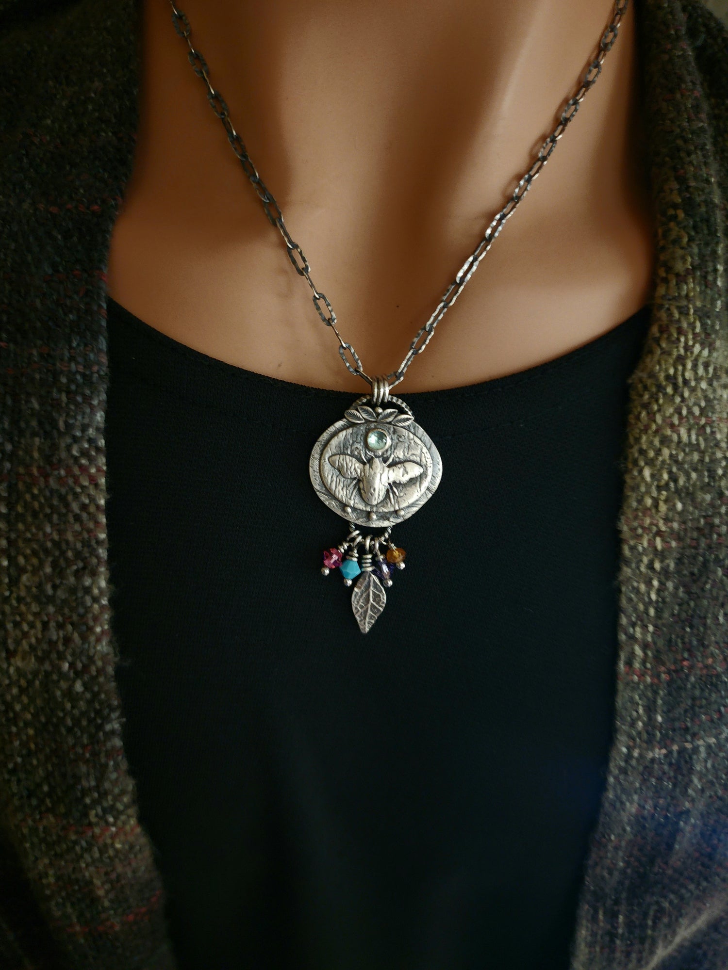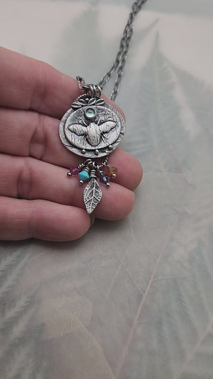 This sweet bee is loaded with colorful crystals to represent a floral bouquet, and a 4mm aqua tourmaline for blue skies!