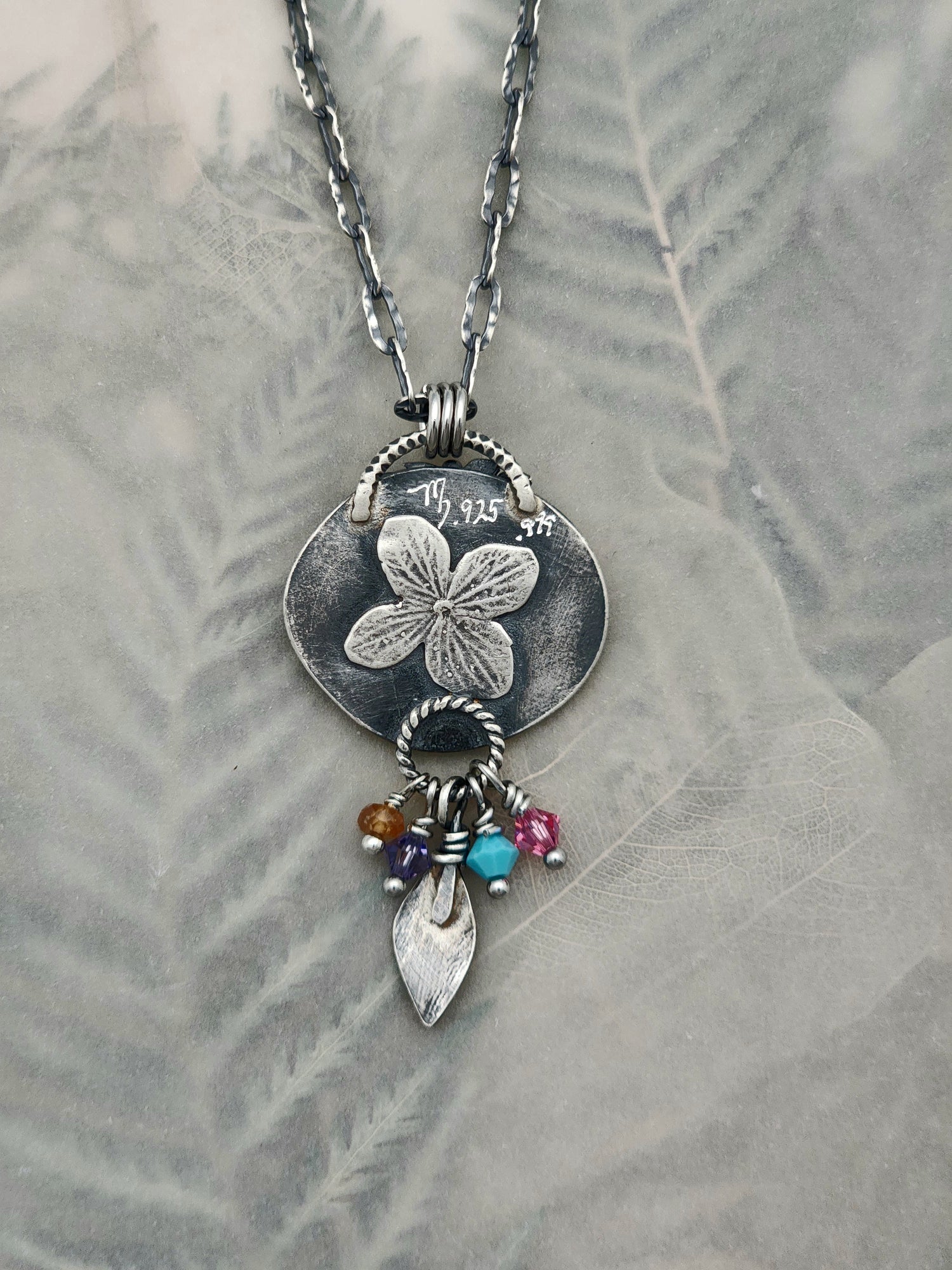 All sterling silver, on a sterling silver 18" chain. Need it longer? add on a extender chain!